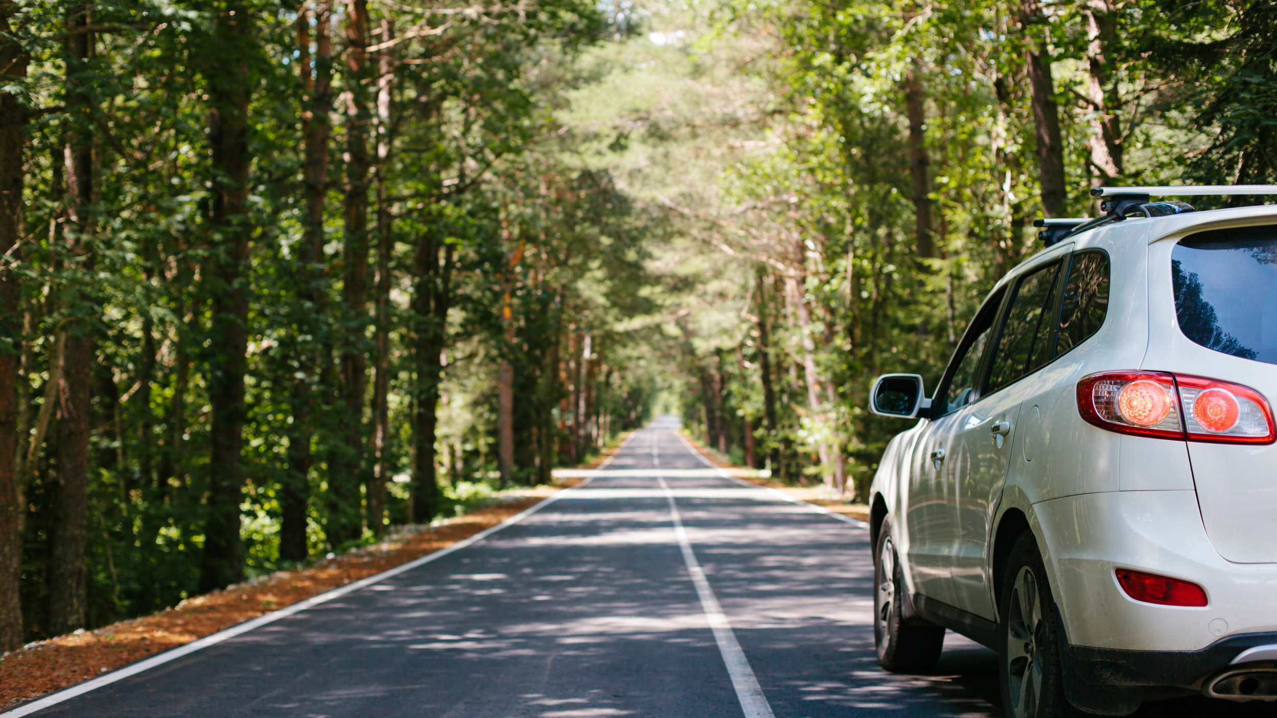 A LIGHT GREY SUV parked on the side of a mountain road with snow-capped peaks and pine trees in the background